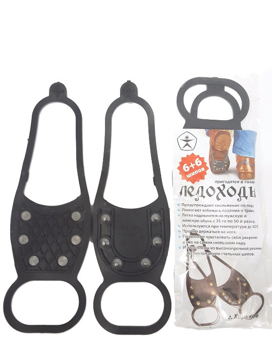 Основа ледоходов сделана из качественной резины, не теряющей свою эластичность в сильный мороз и при любой влажности и которую можно растянуть на любую обувь. На резиновую основу установлены 6 стальных шипов, которые обеспечивают устойчивость при передвижении на обледенелой поверхности дороги. Надежно защитят от падения в гололед. Легко снимаются и надеваются по необходимости на мужскую и женскую обувь. Ледоходы для обуви, благодаря резиновой подошве и наличию шипов, препятствуют скольжению и, тем самым оберегают от падений. Ледоходы имеют лёгкую, удобную, незаметную на обуви конструкцию. 0358