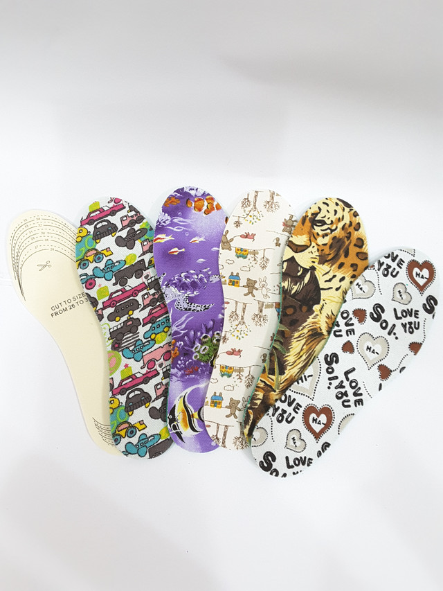 Дитяча обрізна устілка забезпечує гігієну стопи, усунення неприємного запаху взуття, пітливості стоп, антибактеріальні властивості, знижують навантаження при тривалій ходьбі. Виготовлені з тканини та спіненого латексу, швидко вбирають вологу. На нижній частині устілок є малюнок для вирізання необхідного розміру. 0567